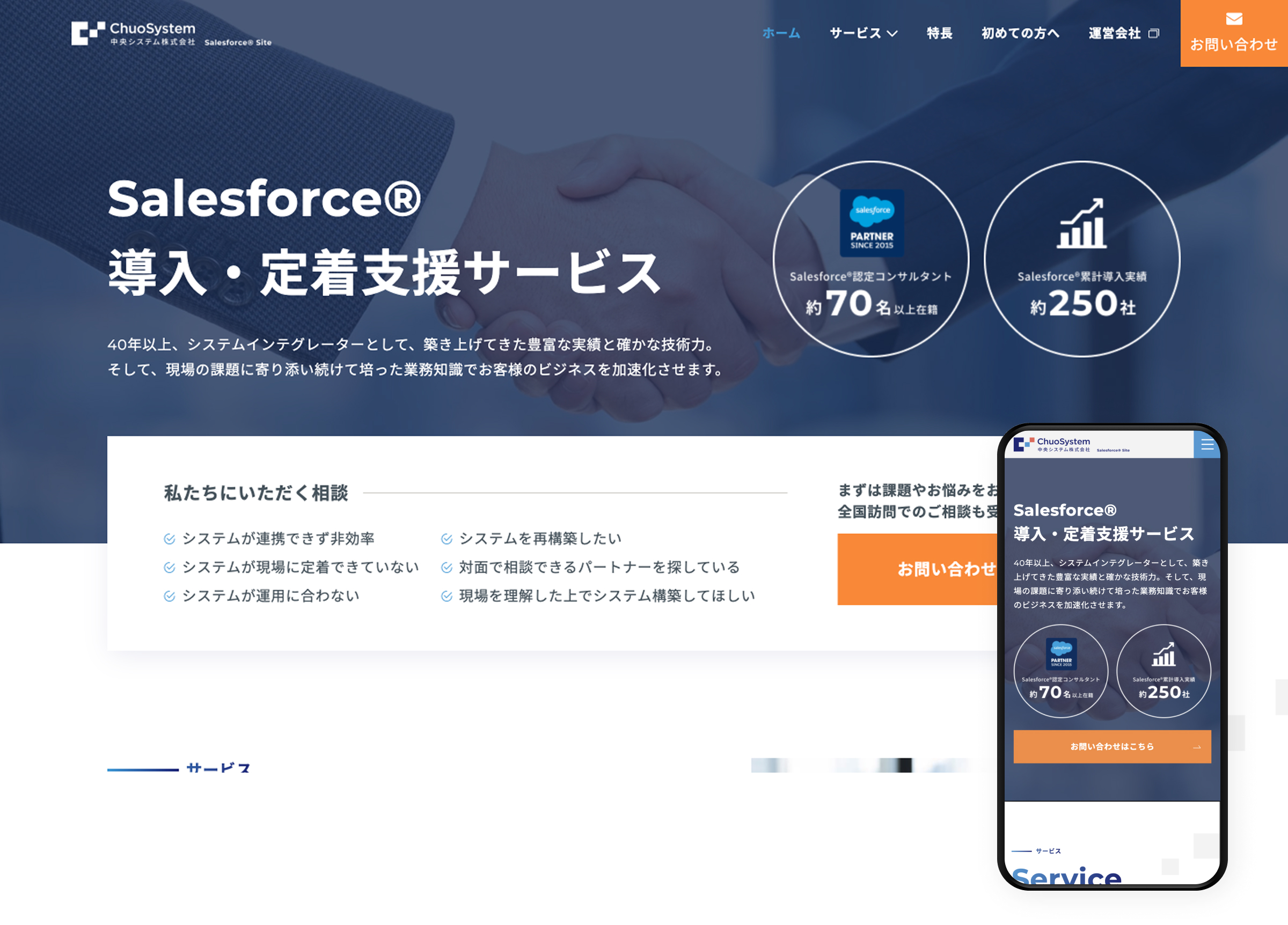 中央システム株式会社からご依頼いただき、「Salesforce®導入・定着支援サービス」のサービスサイトを制作いたしました。同社はSIerとして高い技術力を基盤としながら、Salesforce®導入支援サービスも展開しております。Salesforce®の導入実績は全国250社以上に上り、経験豊富な認定コンサルタントが多数在籍しております。技術力はもちろん、現場に対する深い理解を持つ安定したサービスが特徴です。 これまではコーポレートサイト内の下層ページで紹介されていた当サービスですが、今回のリニューアルにより、独立したサービスサイトとして新たに生まれ変わりました。サイトでは、サービス内容を詳細に掲載し、導入実績の紹介などを通じて、サービスの実態をより具体的に把握できるようにしました。